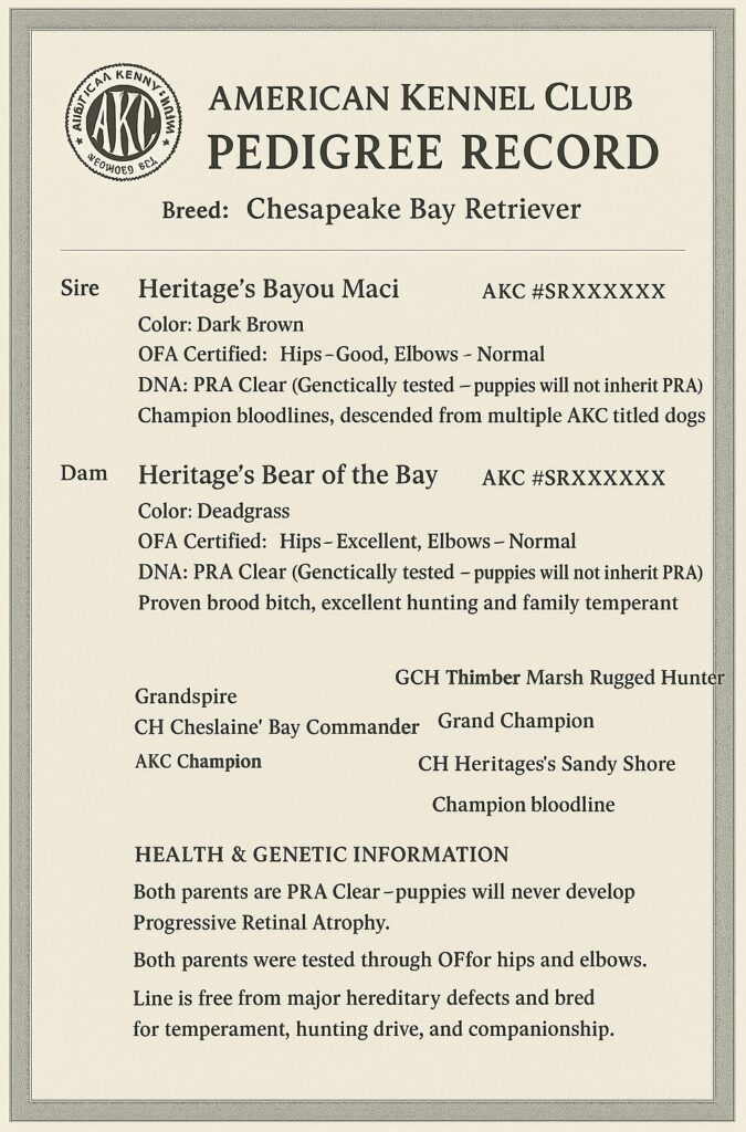 At Heritage Chesapeake Retrievers, we are dedicated to preserving the integrity of the breed through careful selection and responsible breeding practices. This pedigree represents generations of health, quality, and proven performance.